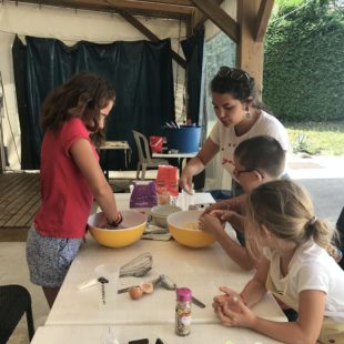 Une campeuse s’adonne à la peinture sur une table de camping, tandis que ses compagnons de vacances discutent sur des chaises longues. Autre lieu, autre ambiance : direction le Mini-Club ! Aujourd’hui, c’est atelier pâtisserie avec confection de Mikados maison. Eugénie et Sacha étalent la pâte et forment de petits boudins à tremper dans le chocolat. Eugénie chipe de temps en temps un morceau de pâte crue pour faire enrager Charline, l’animatrice. C’est encore plus drôle… Après, ce sera chasse aux trésors dans le camping et les jours suivants, canoë, concours Top Chef, etc.