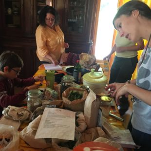 A peine sortis du village, un simple champ nous offre les premiers trésors de notre cueillette. Cette plante aux feuilles composées et dentelées, sur laquelle se penche Emilie, sent étrangement le concombre quand on la froisse sous nos doigts… C’est la jolie pimprenelle, que nous mélangerons à du fromage de chèvre, des noisettes et un filet d’huile d’olive en tartinade. J’en cueille un brin et Marin, 11 ans, le colle sur son herbier. Les noms latins des fleurs et des plantes l’impressionnent, comme par exemple la pimprenelle, qui se nomme poterium sanguisorba !