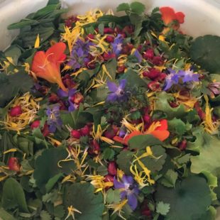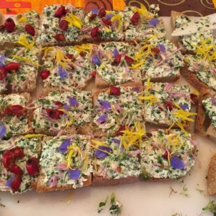 Attablés au soleil, nous admirons, puis dégustons nos jolis mets. Tartinade de chèvre à la pimprenelle et aux noisettes ; salade composée avec plantain, pissenlit, oseille, lierre, fleur de trèfle ; flan de saison avec pissenlit, épiaire, œufs, carottes et ricotta ; poêlée de pommes de terre aux orties ; crème à la ronce et cookies orties/choco. Repus ! C’est beau, c’est délicieux et c’est notre œuvre commune à nous et à la nature !