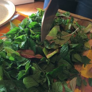 Mais il est déjà midi. Nous cueillons l’épiaire (frotte-la, elle aura d’abord une odeur affreuse, puis une sublime senteur de cèpe) et retournons vite au village. Là, dans la cuisine de l’éco-gîte Charmille de Saint-Julien sur Suran, nous nous mettons activement aux fourneaux. Ça hache, ça coupe, ça filtre, ça fait infuser toutes ces petites dames vertes. Au bout d’une bonne heure et demie, le repas est prêt et ça tombe bien : tout le monde meurt de faim !