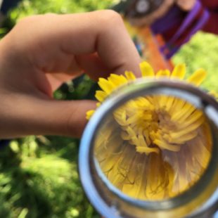 Près du prunus, nous goûtons l’astringence de la prunelle, avant de découvrir de splendides Taraxacum Opicinalé, cette fleur jaune connue de tous. Rien de plus classique que le pissenlit, excellent dépuratif pour le foie et la vésicule biliaire ! Mais saviez-vous que chaque pétale est en réalité une fleur avec son pistil et sa graine ? A la loupe, nous étudions cela de très près, c’est fascinant. Le pissenlit se mange en câpres avec ses boutons, en confiture avec la fleur, en salade ou en soupe avec les feuilles. Les racines, à ramasser en automne ou en hiver, sont excellentes séchées ou torréfiées en tisane !