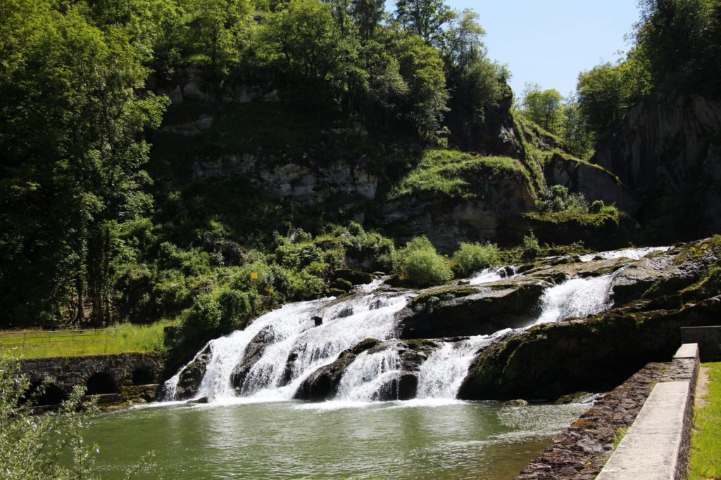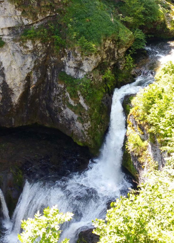 Emmitouflée dans sa couverture boisée et cernée de corniches, la rivière Lemme chute d’une étroite fissure au milieu des falaises. Ses eaux tumultueuses jaillissent superbement en deux cascades successives sur 28 m de haut.