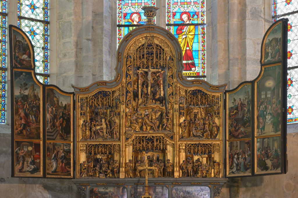 Le retable anversois dédié à la passion du Christ est un véritable chef-d’œuvre. Il se trouve dans le chœur de l’église à sa place originelle : sur le maître-autel. Il fut offert au début du 16e siècle par la ville de Gand à l’abbé de l’époque, Guillaume de Poupet. Imposant, ce triptyque polychrome en chêne des bords de la mer Baltique de 5,60 mètres d’envergure est une œuvre majeure de l’art flamand, l’un des plus grands d’Europe. Lorsque l’on se rapproche, les détails des 25 panneaux (6 sculptés et 19 peints) soulignent le caractère exceptionnel de l’œuvre consacrée à l’histoire du Christ.