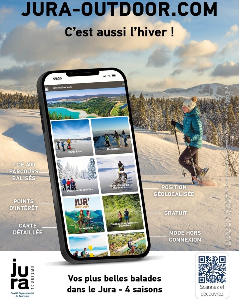 Simple, rapide et efficace, Jura Outdoor, en plus des 300 parcours estivaux, offre désormais, aux pratiquants de sports et loisirs de pleine nature près de 300 parcours supplémentaires, officiels et balisés de ski de fond, raquettes, pistes multi-activités, et même des pistes pour traîneaux à chiens dans tout le Jura.