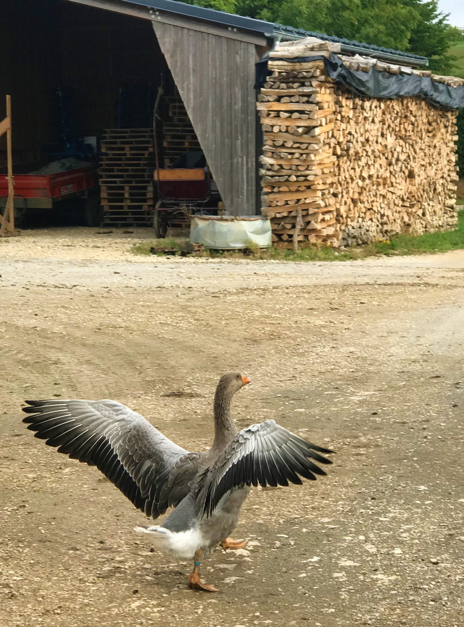Depuis le balcon de sa chambre, Christiane ouvre grand les volets après une bonne nuit de sommeil à la campagne et découvre les pâturages où les vaches paissent au loin. « J’adore ! », s’exclame l’Alsacienne venue passer quelques jours à La Grange Combaret de Cernans, avec quelques amis. Le petit-déjeuner est royal et servi dans de grands bols en porcelaine, agrémenté de madeleines maison confectionnées par Florence, de pain frais et d’un café absolument gourmet . Trois jours de vacances à la ferme à la Prévert avec veaux, vaches, canards, oies, abeilles, lapins, chevaux comtois, chiens, chat, poules et poulets !