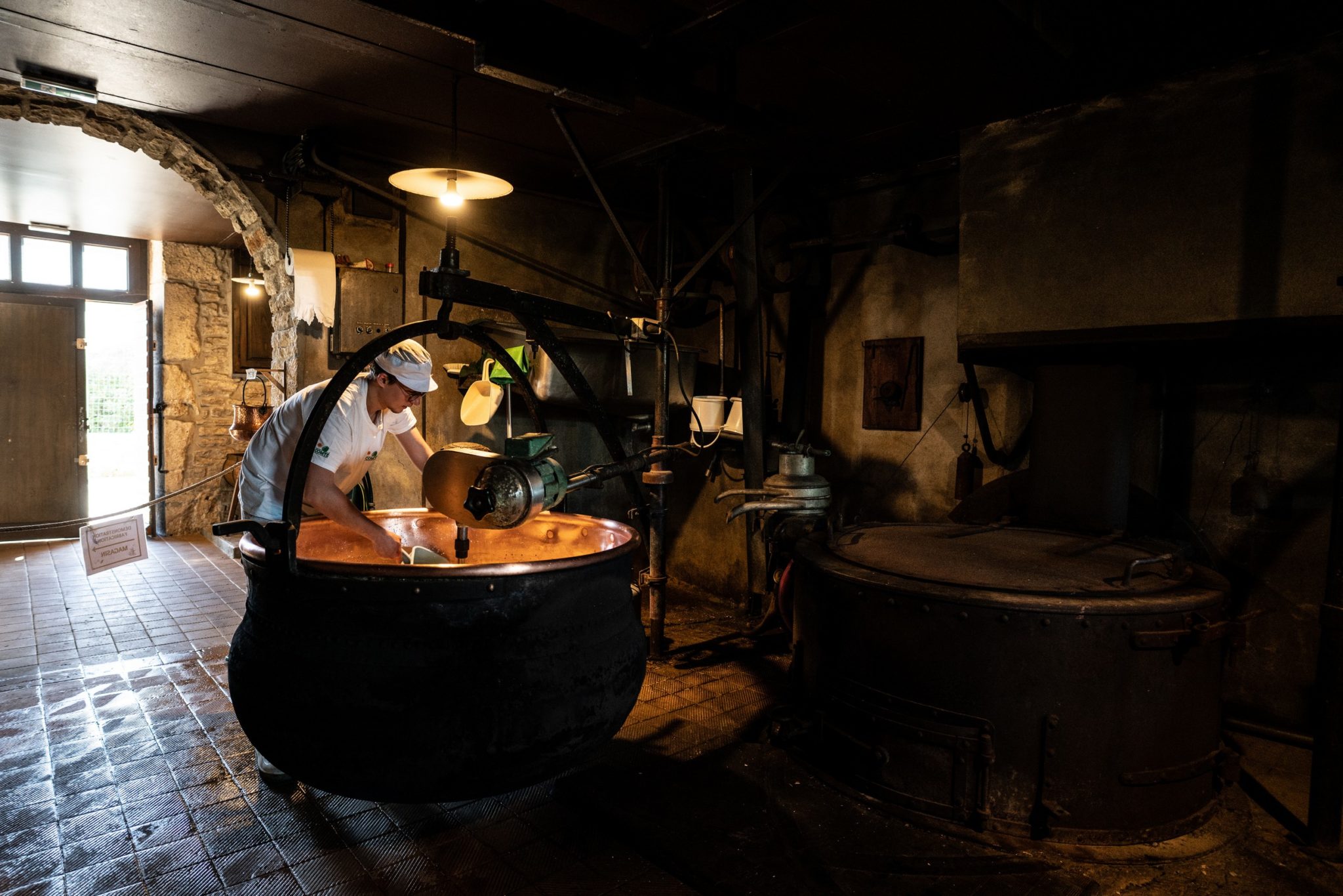 Une meule par jour et pas toute l’année. À Thoiria, dans un bâtiment de 1837, Amandine et Paco font du Comté comme autrefois. Au tranche-caillé manuel, dans un chaudron de cuivre chauffé au feu de bois et en soutirant le caillé à la toile ! L’expérience est sensorielle, vivante, drôle et enrichissante avec un fromager enjoué et sympathique, qui vous fait passer le savoir avec appétit ! Une visite futée…