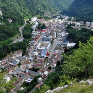 Depuis le Balcon des Crottes à Morbier, un panorama complètement dégagé s’offre à vous, dévoilant Morez et les gorges de la Bienne qui se resserrent et s’étirent d’un bout à l’autre de la ville. Remarquez sur votre droite, la Maison Lamartine et sur votre gauche, la ligne ferroviaire des Hirondelles à flanc de falaises.