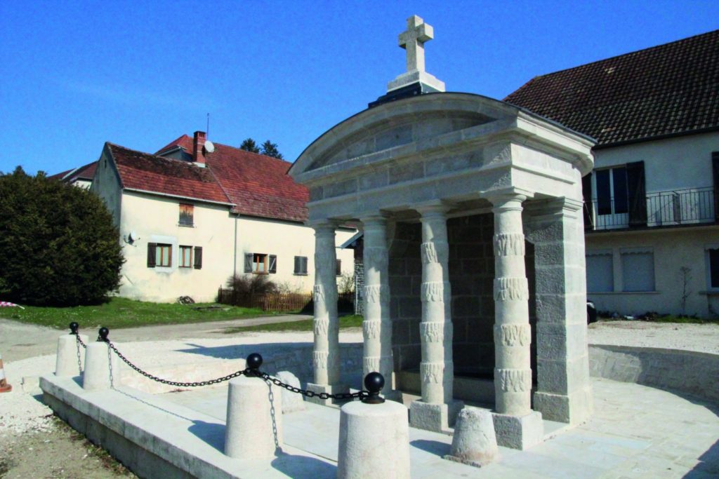 Dotée de puissantes colonnes à décor en glaçons et surmontée d’une croix, cette fontaine du XVIIIe siècle a bénéficié du soutien de la Mission Patrimoine Bern 2020 ouvrant la voie à une importante restauration. Non loin de là, La Fontenotte, fontaine lavoir, est dominée par un très beau nymphée à quatre colonnes rustiques, copie de celui de Wideville. Ne la manquez pas !