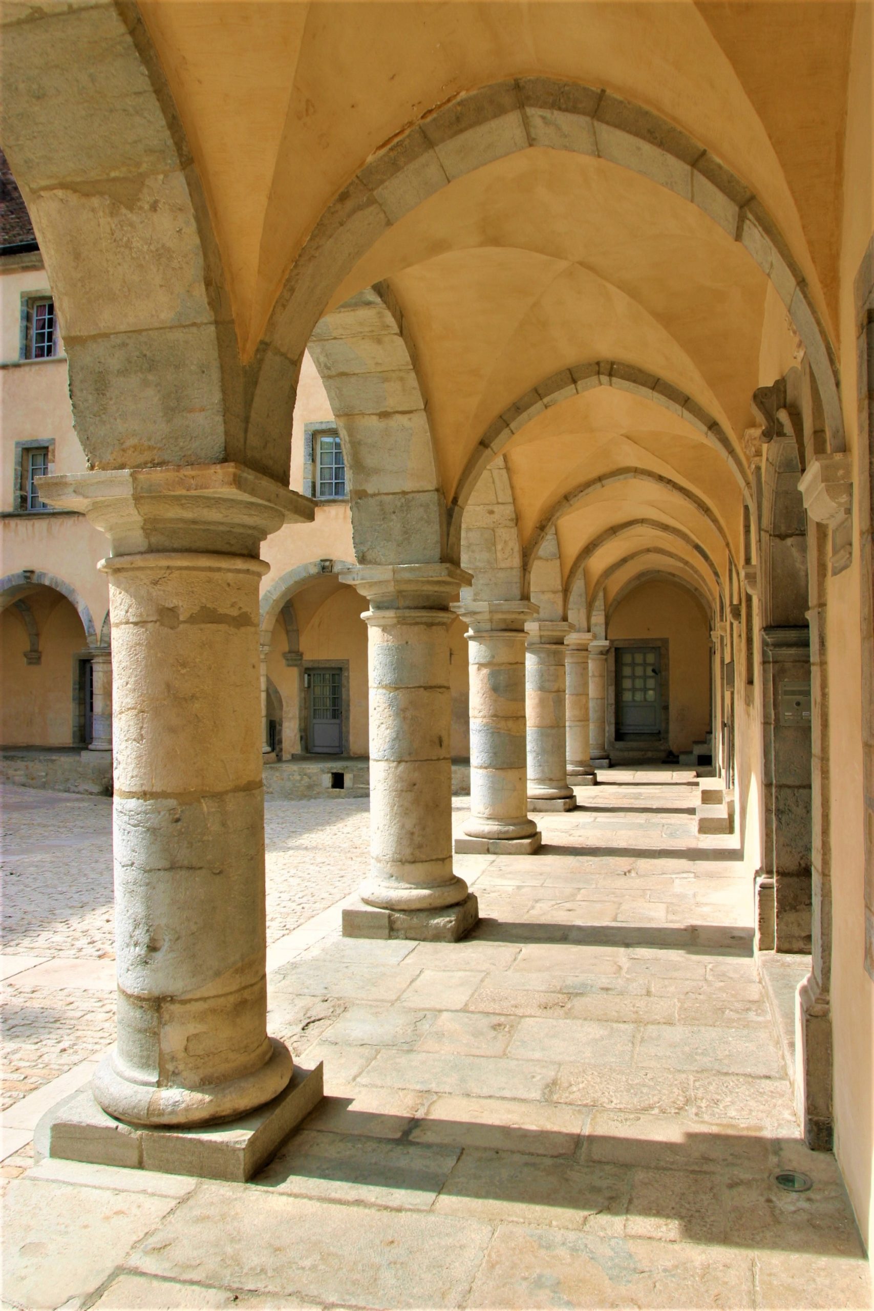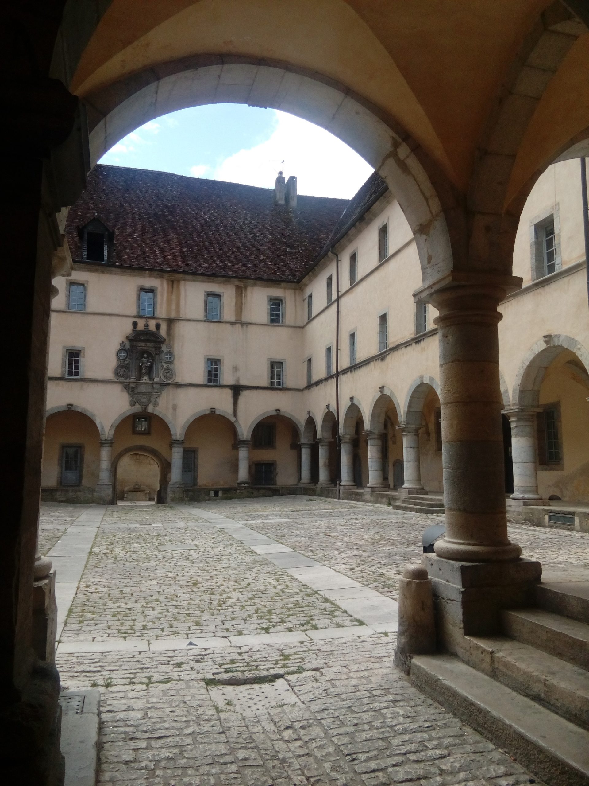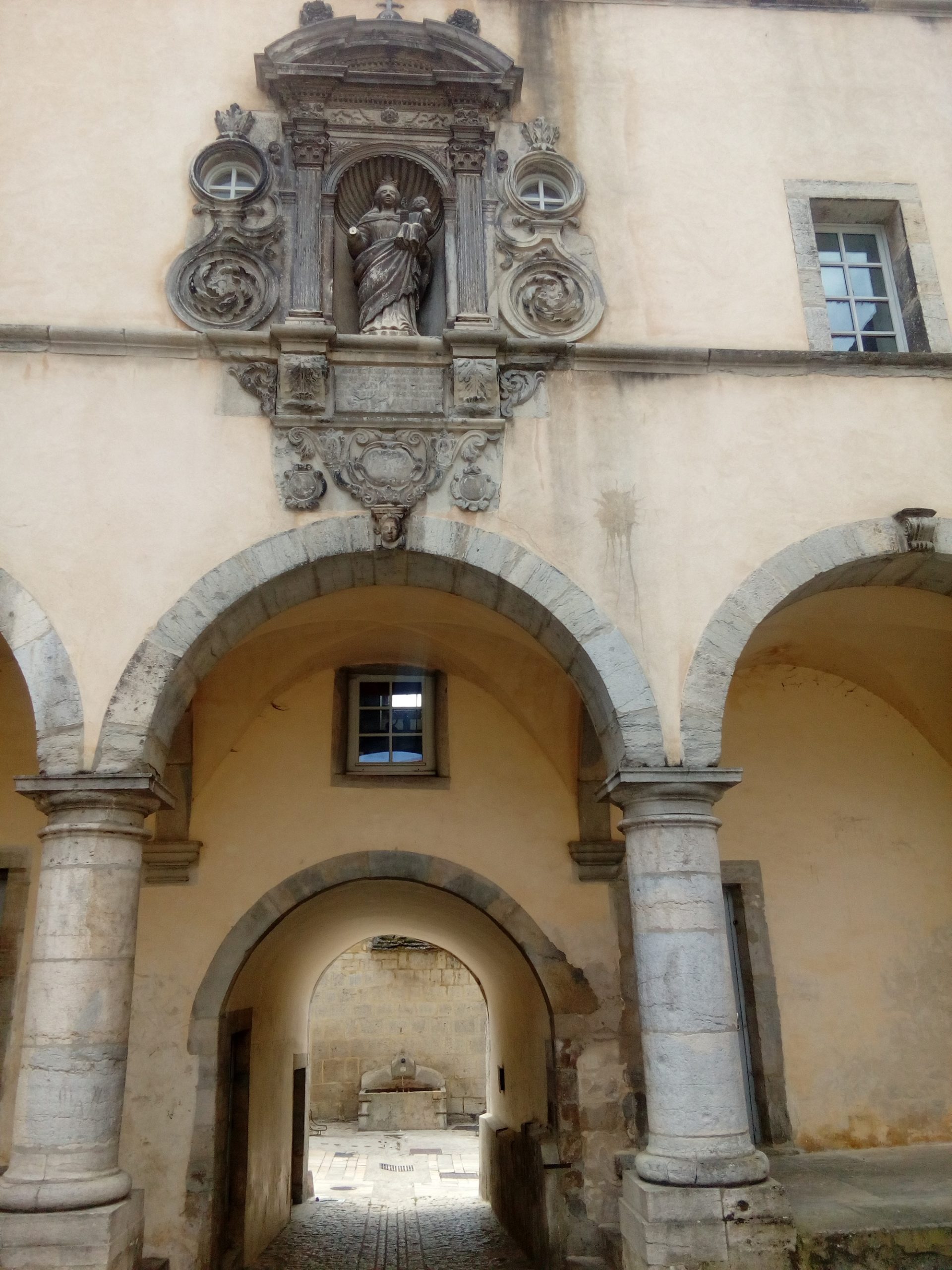 La cour est de forme rectangulaire et possède 19 arcades en plein cintre toutes reposant sur des colonnes d’ordre toscan. Au-dessus de l’une des entrées de la cour, une niche à coquille abrite une Vierge à l’enfant de style bourguignon.