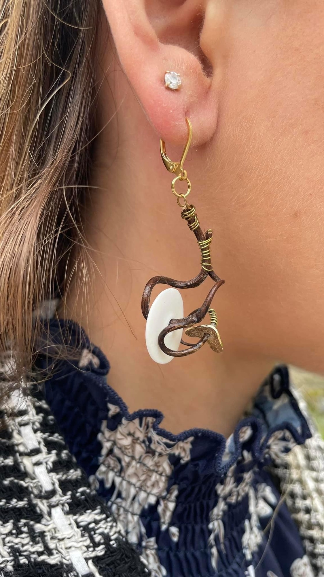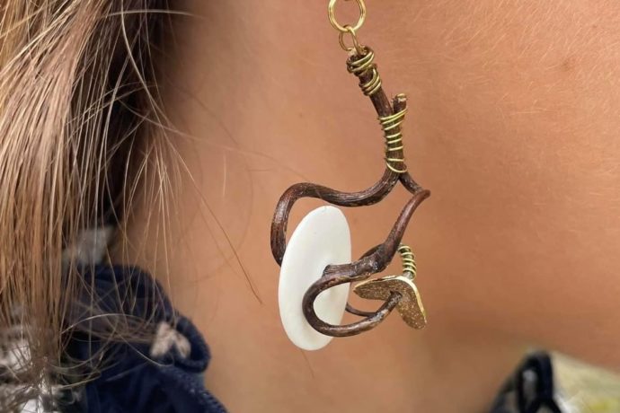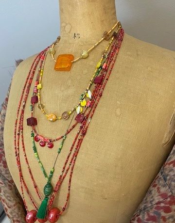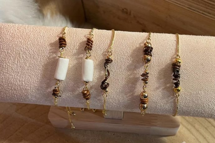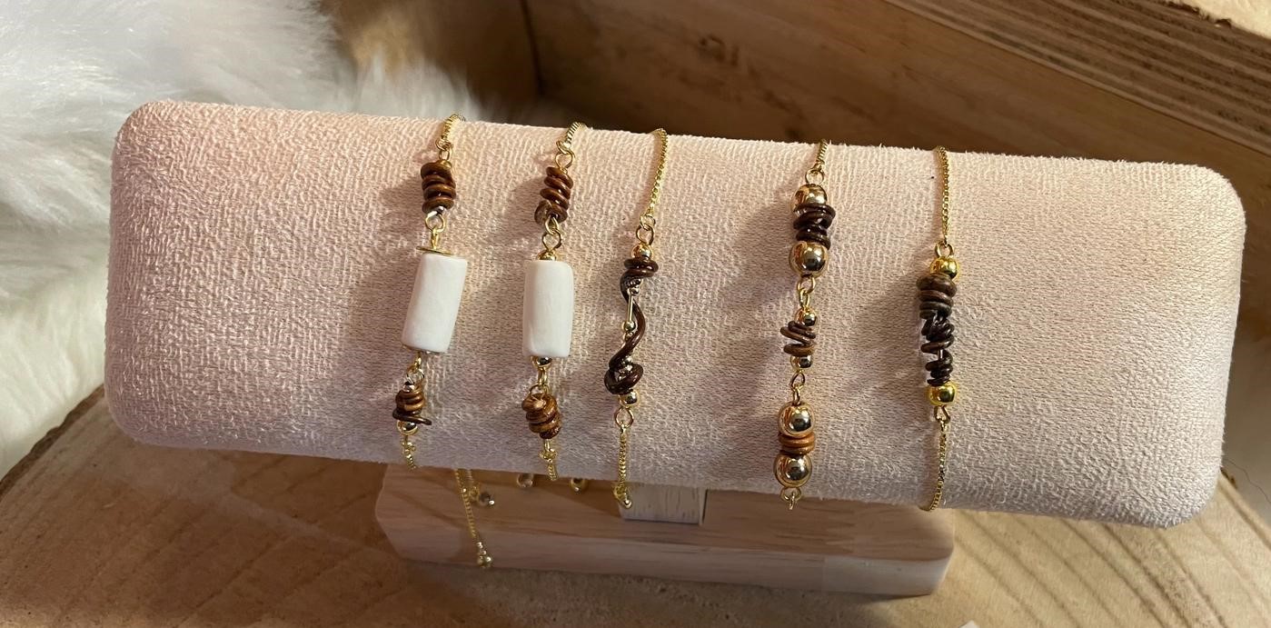Mes bijoux, quelques centaines de pièces, sont essentiellement conçus avec des pierres semi-précieuses, des perles en verre, de la nacre ou de la céramique auxquelles j’ajoute ma touche d’apprêts, de pampilles, de graines, de bois, de cuir, de tissu...