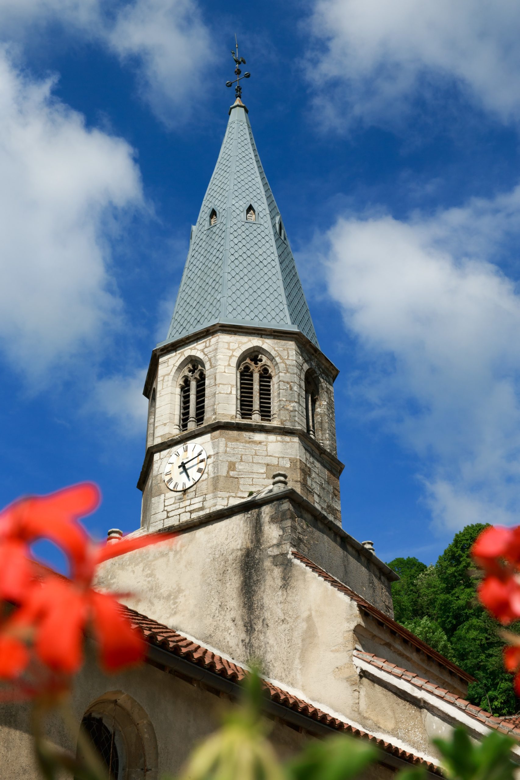 Le clocher mesure 32 m de haut, la flèche est en tuf.
