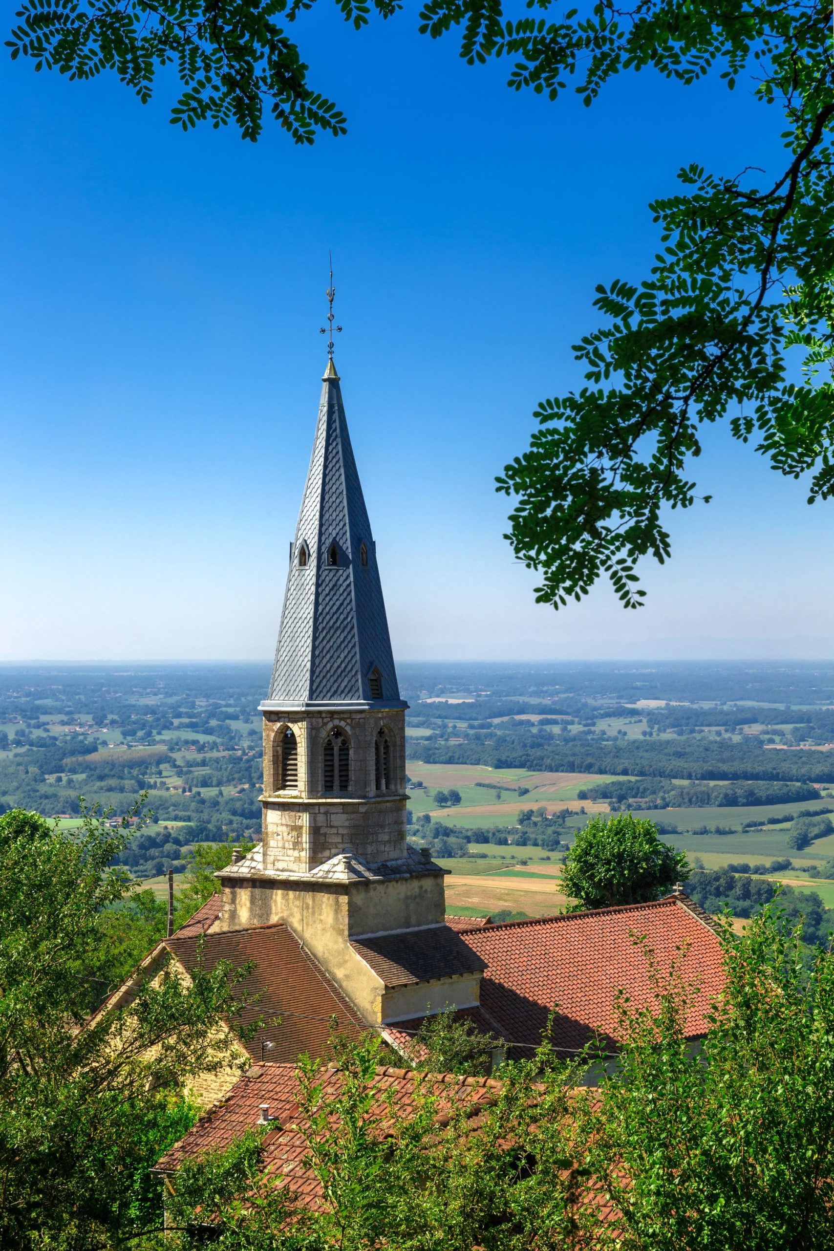 Devant l'église une vue panoramique sur la plaine de Bresse s'offre à vous. on peut distinguer les Monts du Châlonnais et du Mâconnais au lointain. Un panneau d'information vous donnera des informations sur le paysage et le patrimoine local.