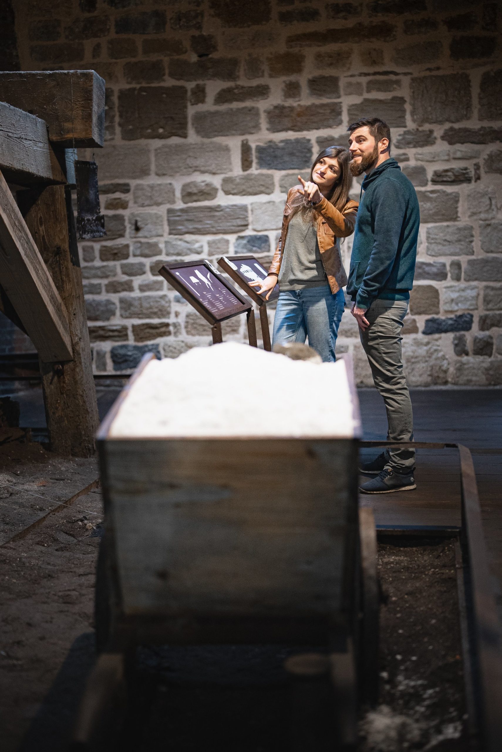 Accompagné d'un guide, vous descendrez d'abord au coeur même de l'histoire, dans les deux puits d'extraction de saumure protégée par des voûtes majestueuses. Cette galerie monumentale, construite au XIe siècle à l'image d'une cathédrale, s'étend sur 165 mètres de longueur et 10 mètres de hauteur au coeur même de la ville. Elle abrite encore aujourd'hui un système de pompage mû par une roue à augets et un grand balancier du XIXe siècle encore en fonctionnement et remontant une saumure chargée à 330 grammes de sel par litre (plus salée que la Mer Morte !). La visite se poursuit dans le bâtiment des évaporations où vous pourrez ressentir l'atmosphère de travail des sauniers. Tout ici est préservé, authentique : les outils, les chariots de sel, les boiseries rongées et la dernière poêle à sel de France, témoin émouvant de la mémoire ouvrière du sel.