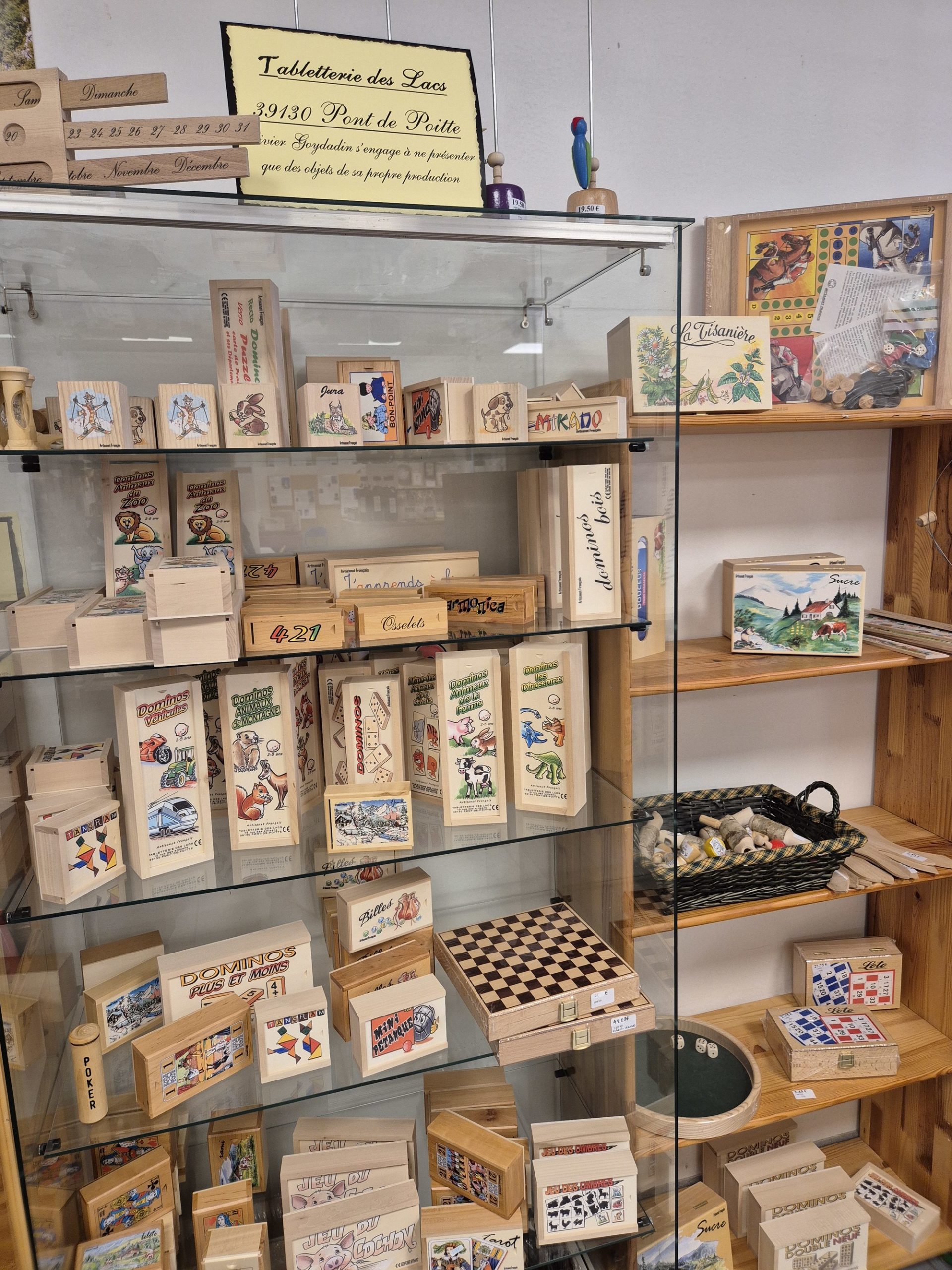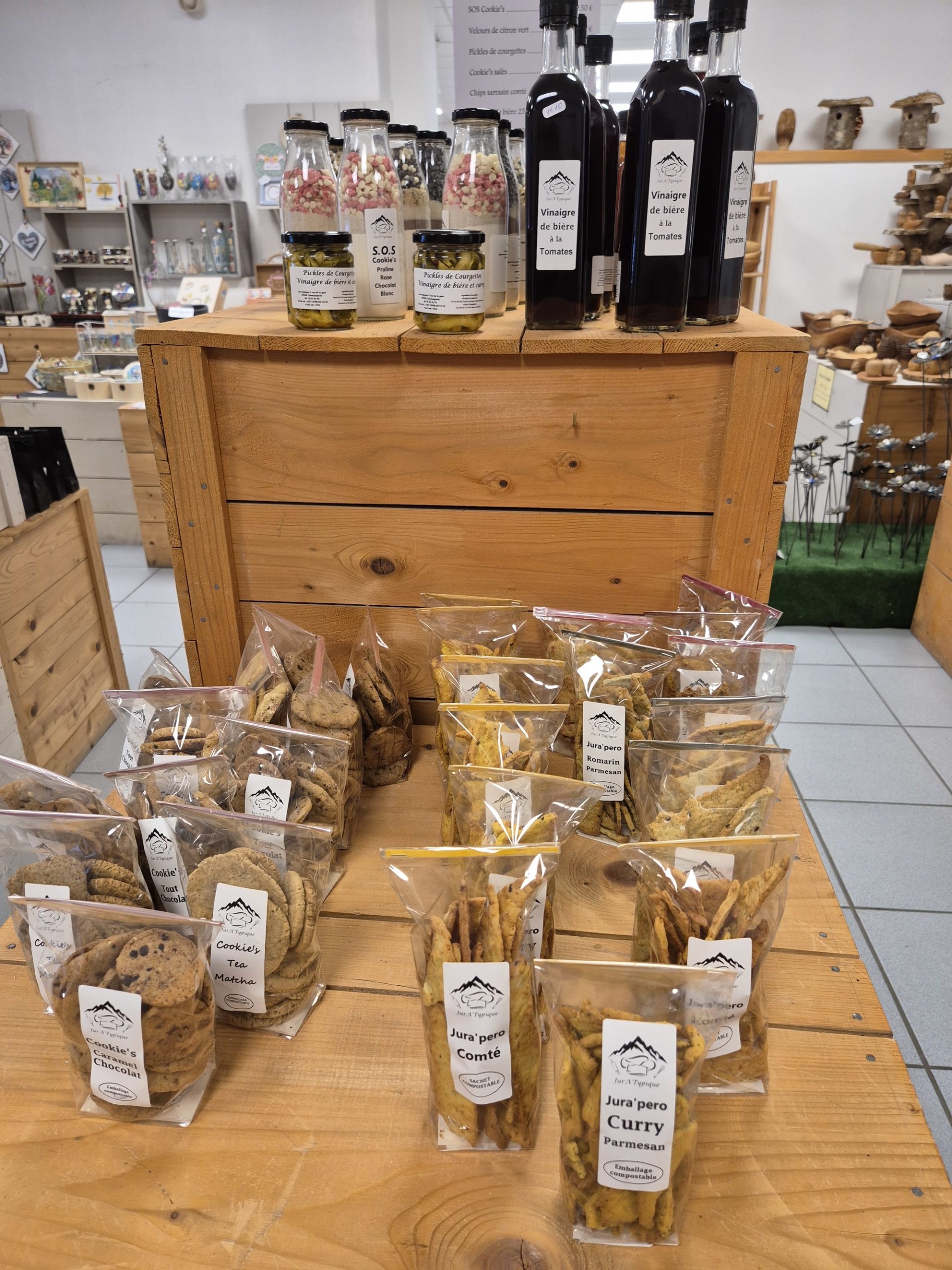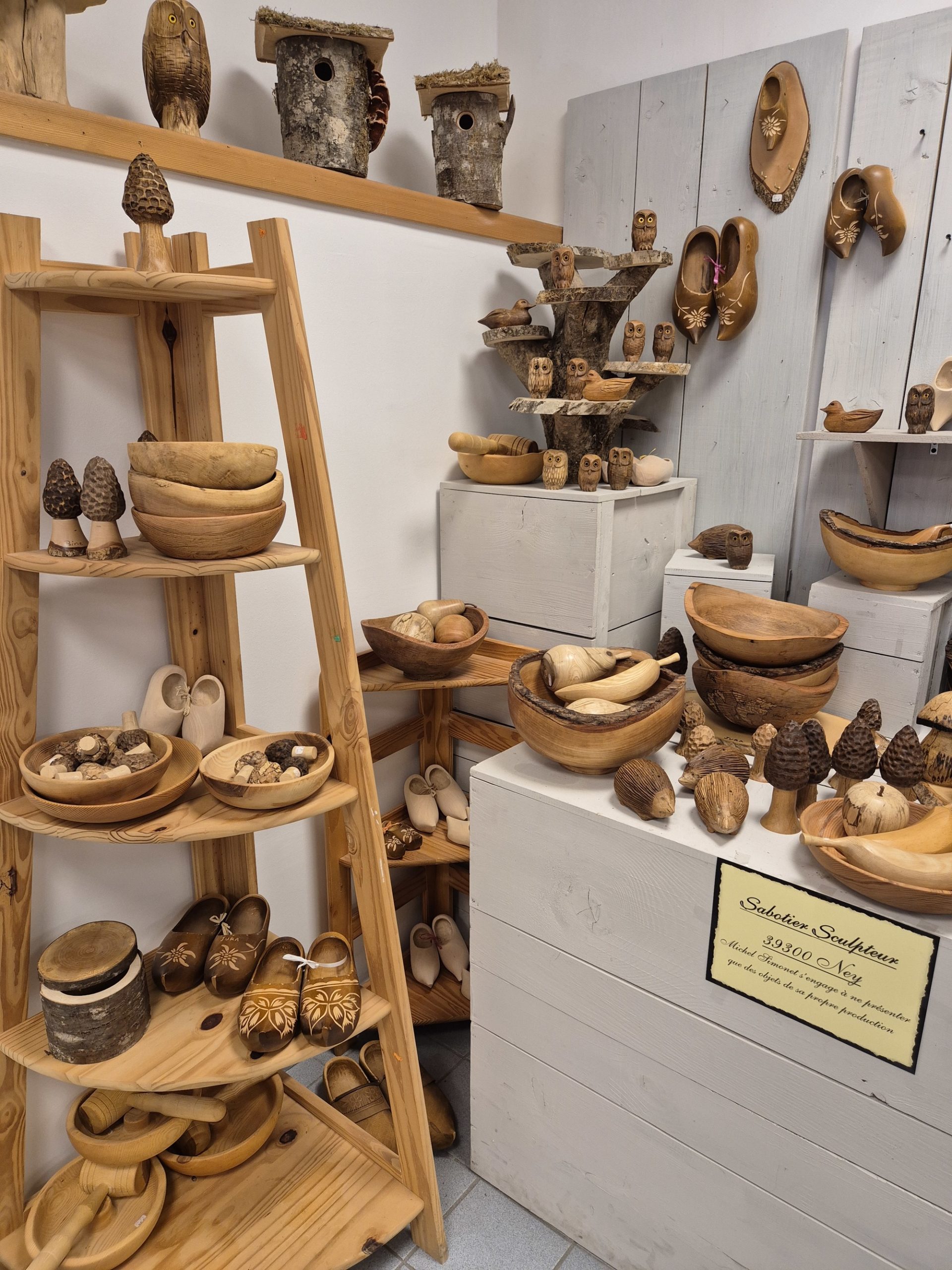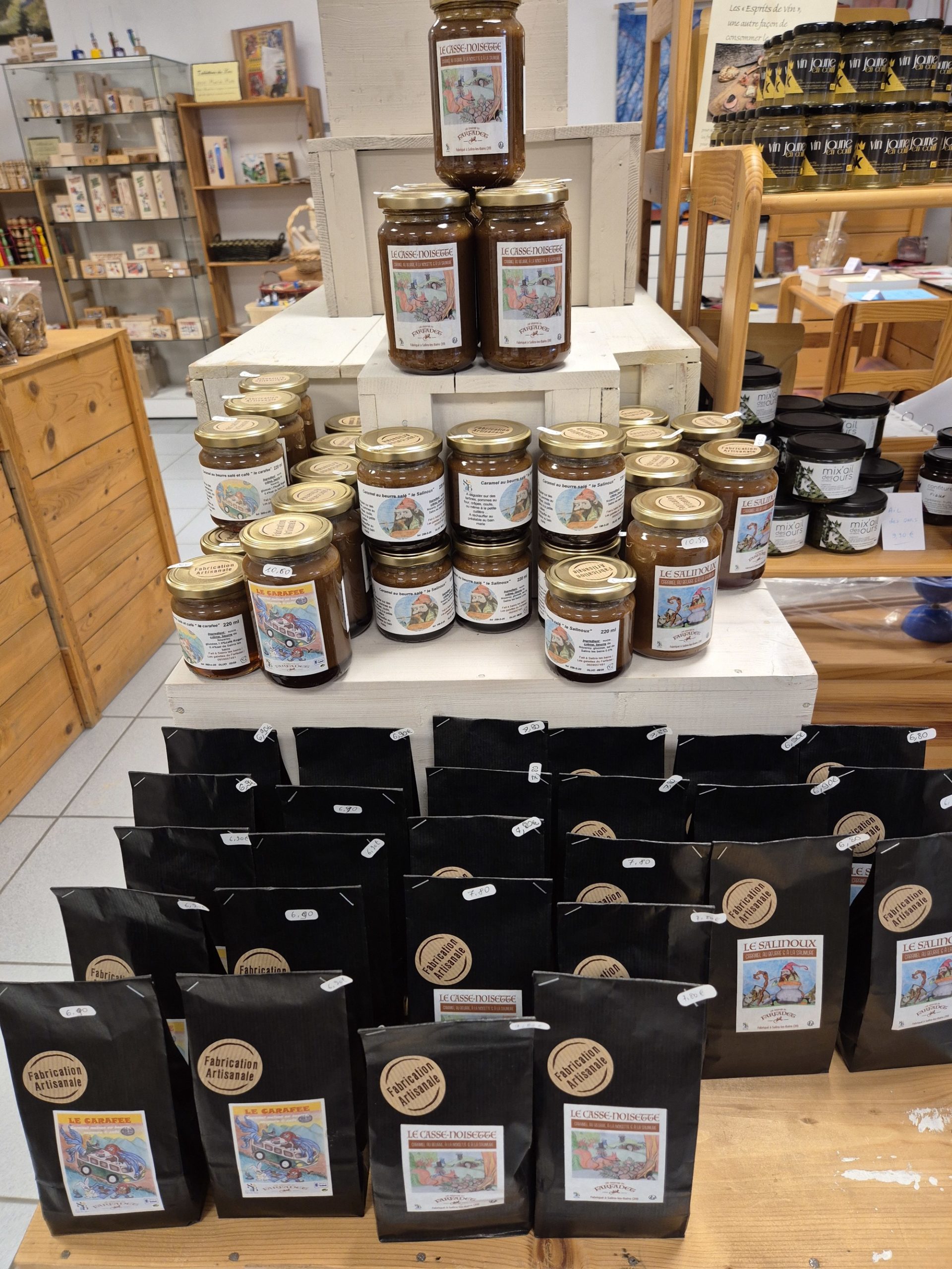 C'est le concept de ce magasin, qui expose des objets très diversifiés, mais qui ont un dénominateur commun : tous ont été fabriqués par un artisan jurassien, que celui-ci soit tourneur, potier, émailleur, lapidaire ou verrier. Alors... un jouet en bois, un bijou émaillé, une pipe ou un sac en cuir ? Mais on peut aussi craquer pour un produit de bouche, comme pour cette confiture d'abricots au basilic (un délice!), ou ce petit pot de confit de Vin Jaune...