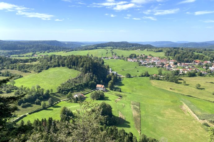 Aménagé sur un éperon rocheux au-dessus du plateau de Chaux-des-Crotenay, le belvédère du Rachet offre une vue grandeur nature sur la forêt de « Derrière Cornu », le rocher de la Baume, les gorges de la Saine et de la Lemme ainsi que le bucolique plateau de Nozeroy, voire sur le mont Rivel par temps clair.
