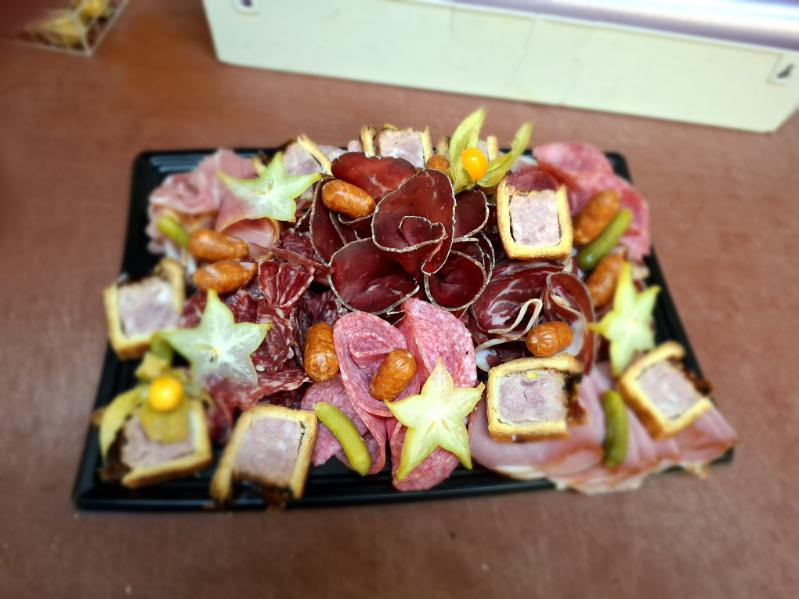 - Charcuteries Maison et Médaillées : Laissez-vous tenter par une large gamme de charcuteries préparées sur place dans le respect des recettes traditionnelles. Nos produits sont régulièrement récompensés, comme notre boudin noir, médaillé d'or (2019), ou notre pâté de tête, lauréat d'un Trophée européen. Goûtez également nos recettes emblématiques comme la terrine grand-mère ou les rillettes comtoises.