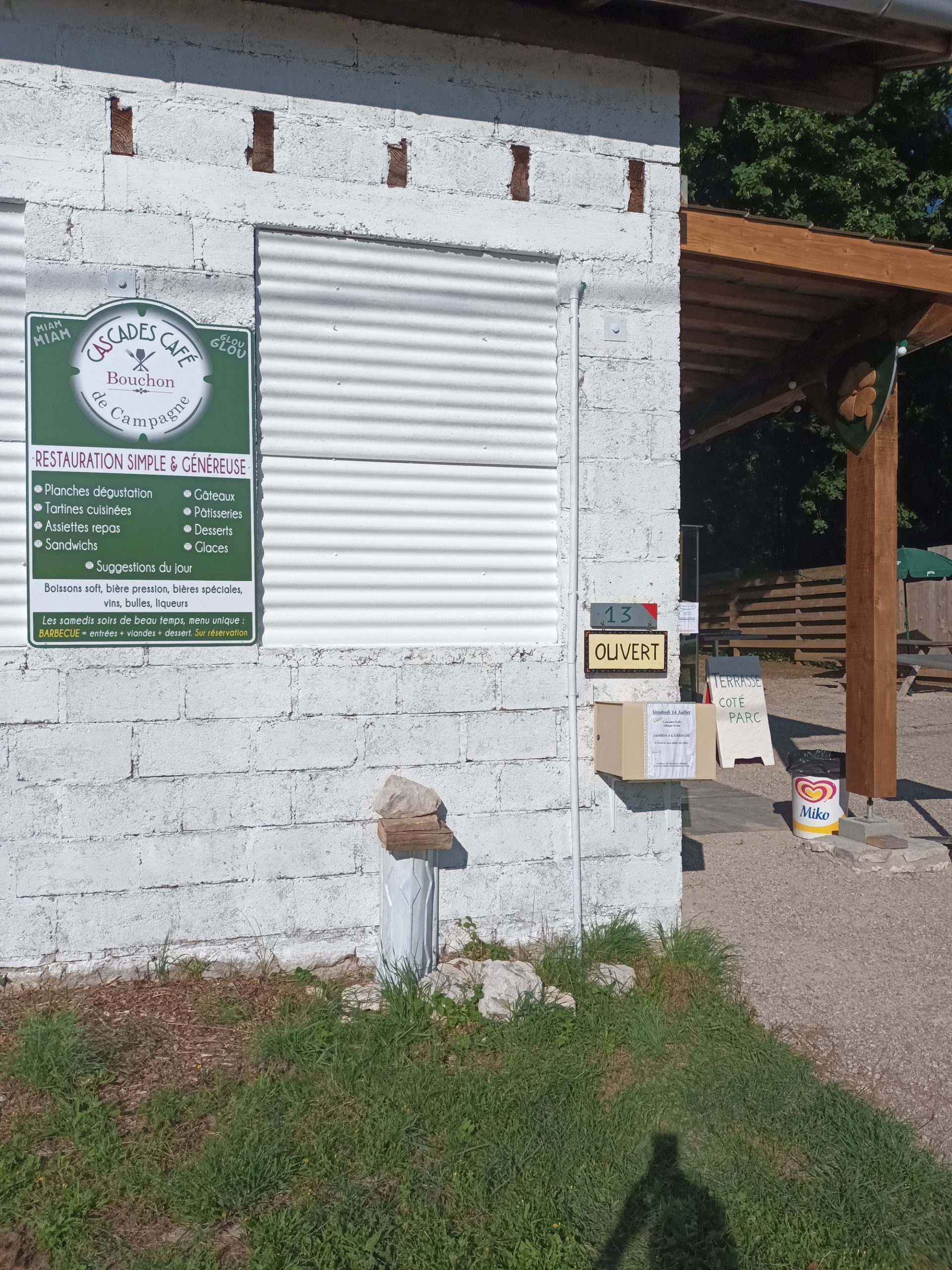 CASCADES Café- Bouchon de campagne- Miam-miam et Glou-glou à toute heure : Restauration simple gourmande généreuse-sandwich-planches dégustation-tartines cuisinées-assiettes repas végé -pâtisseries-desserts-glaces-Suggestions du jour-Boissons soft,bière pression, bières spéciales,vins,bulles-liqueurs-Les samedis soirs repas unique Barbecue sur réservation-Accueil en extérieur plein-air-terrasse- Cadre champêtre,sympathique, convivial- CASCADES Café ferme les lundis + Mardis + jours de pluie.