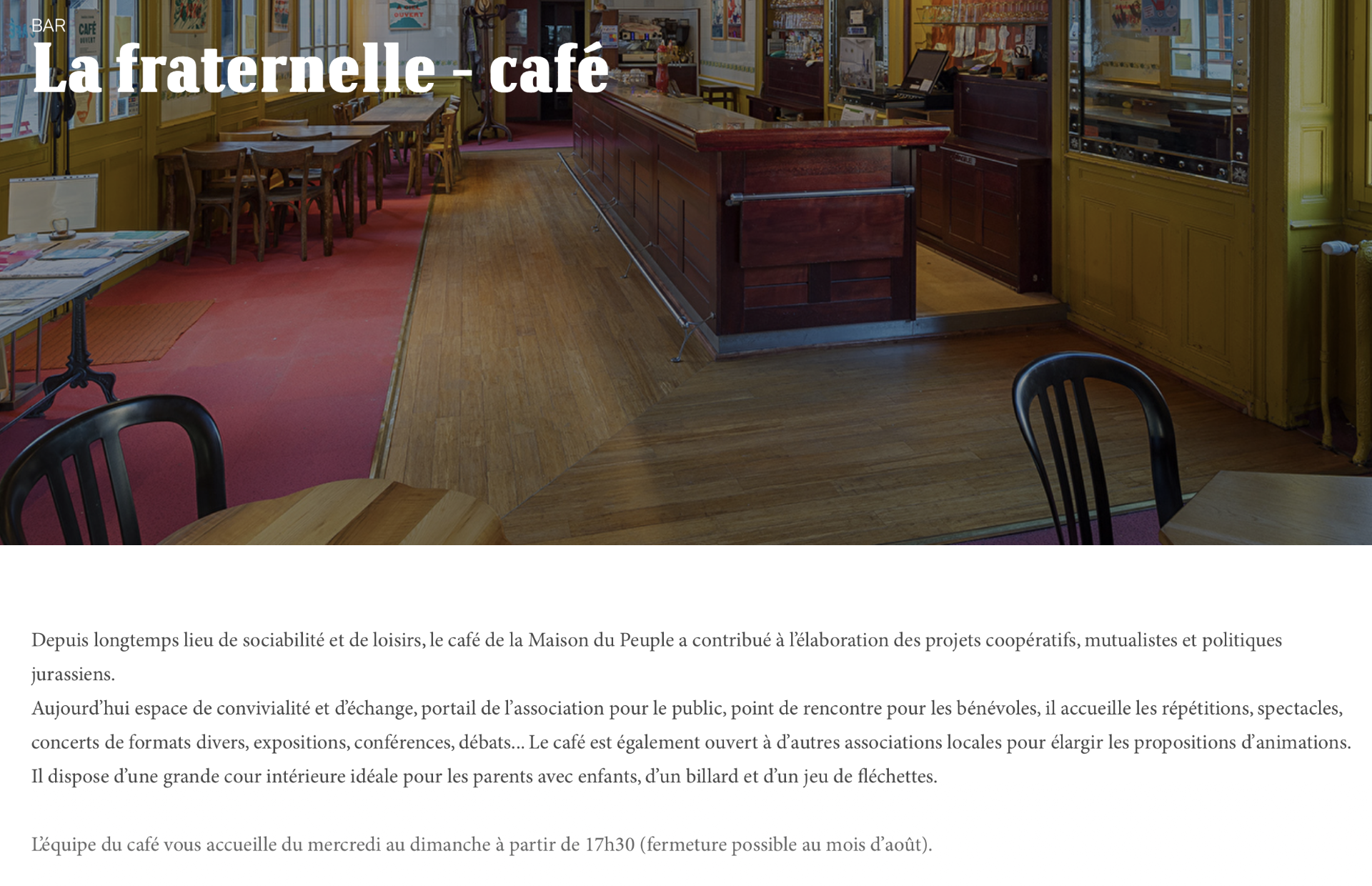 Comme le bâtiment de la Maison du Peuple, la salle du café est un lieu privé qui vit grâce à l'engagement et à l'action des bénévoles et des salariés de l'association.