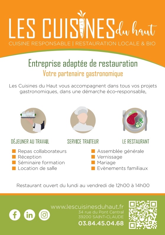 LES CUISINES DU HAUT est une entreprise adaptée de restauration qui emploie majoritairement des personnes en situation de handicap. Elle propose des déjeuners au travail, un service traiteur et vous accueille dans son restaurant situé à proximité du centre ville à Saint-Claude.