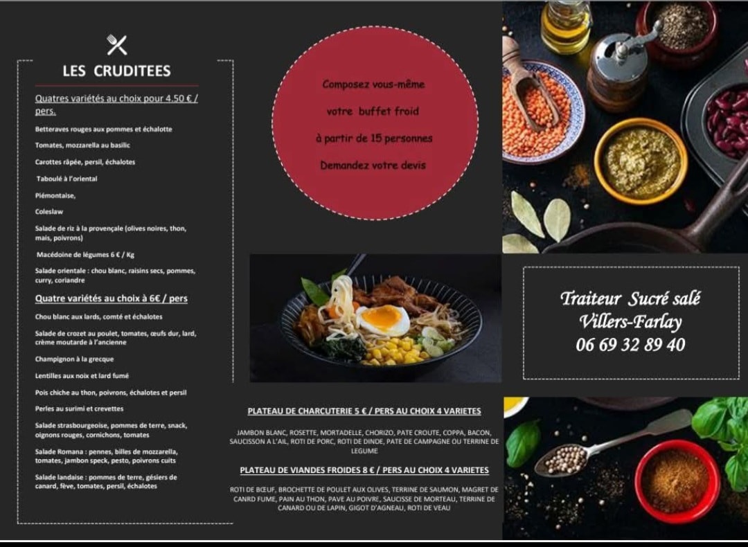 Mignardises, buffets froids, repas complets, gâteaux... avec le service traiteur s'adapte à vos besoins.