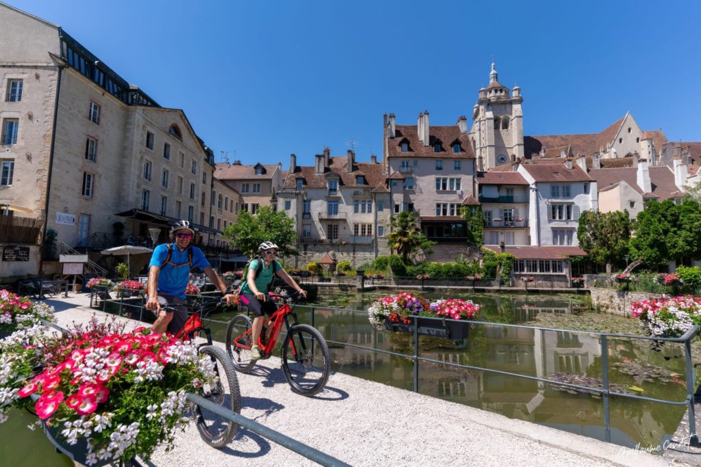 Tout juste deux heures de route nous amènent, Alice Florent et moi, d’Annecy au Fort des Rousses dans le Haut Jura. C’est ici que Florian nous attend pour nous amener à Dole, point de départ de notre Echappée Jurassienne à VTT électrique. Nous déjeunons donc tous les quatre au restaurant Le Moulin des Écorces côté bistrot, au bord du Doubs en terrasse au soleil. Le trip commence bien !