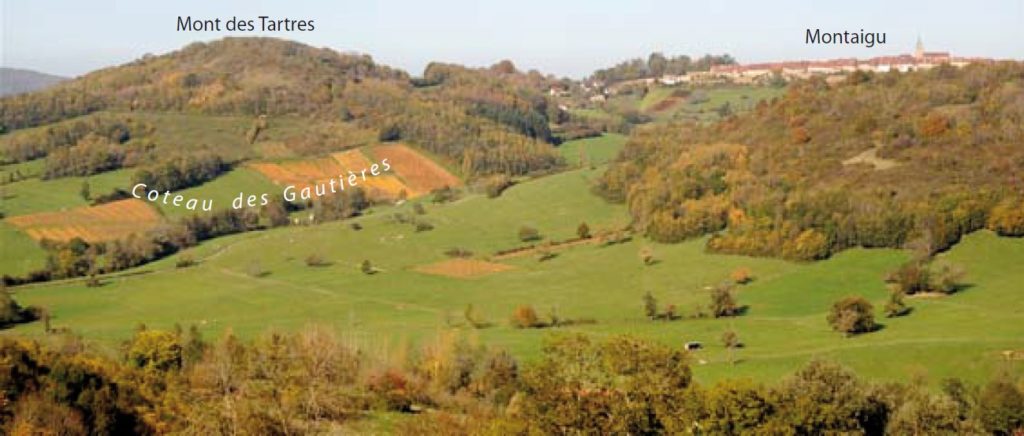 D’orientation générale Nord/Sud-Est, le village de Montaigu surplombe deux beaux versants à substrat marneux, tout à fait favorables à la vigne. Le versant d’exposition Sud/Sud-Est, le plus favorable, domine la vallée de la Sorne (reculée de Vernantois). La base du versant Sud-Est du Mont des Tartres (coteau des Gautières) présente une situation optimale, entre les altitudes 310 et 380 m. Installés dans une zone faillée, les terrains viticoles sont constitués à la fois de marnes irisées du Trias (partie Est) et de marnes grises du Lias (partie Ouest).