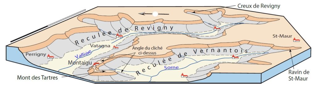 Les deux reculées sont séparées par un éperon de largeur variable, qui s’amincit progressivement vers l’aval, pour se terminer par une crête étroite sur laquelle s’est installé le village de Montaigu. Chaque variation de largeur de l’éperon central est du à des failles, qui préservent ou atténuent l’épaisseur de la couverture calcaire du plateau.