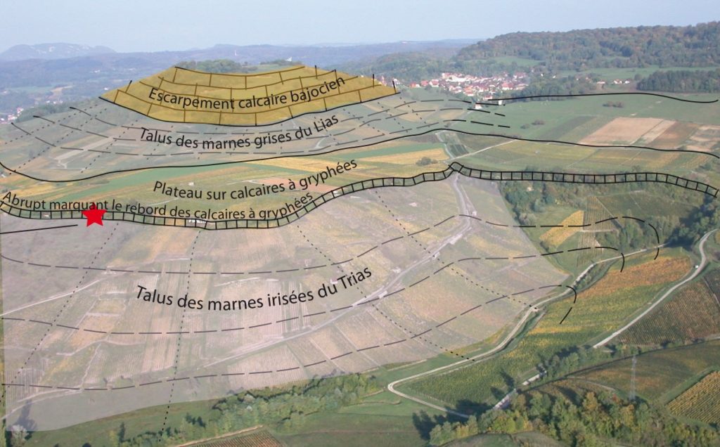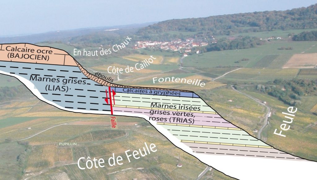 - vient ensuite le versant à forte pente de «Côte de Feule» et de «Feule», reposant sur les marnes irisées du Trias et dont l’altitude va de 380 m à 300 m. Une cassure (faille) est venue perturber la disposition des couches géologiques du coteau. À droite de la faille, le compartiment de Feule est remonté d’une centaine de mètres par rapport au compartiment de Caillot, à gauche de la faille.