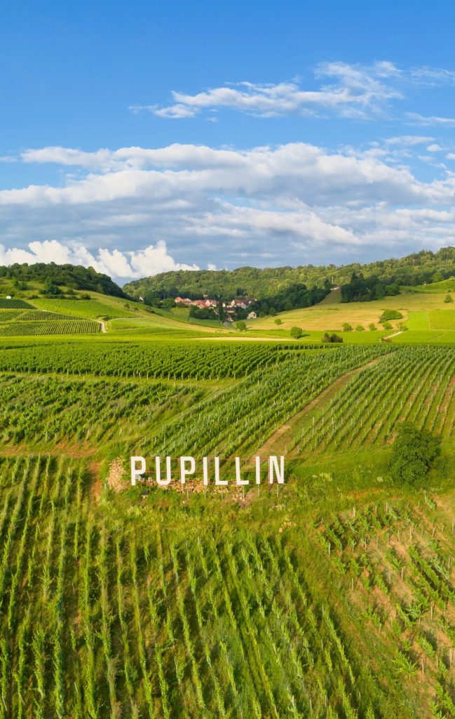 Dominée par des lettres hollywoodiennes du nom du village, ce terroir à forte pente constitue l’un des crus les plus renommés de Pupillin. Le Ploussard s’y épanouit sur des marnes irisées.