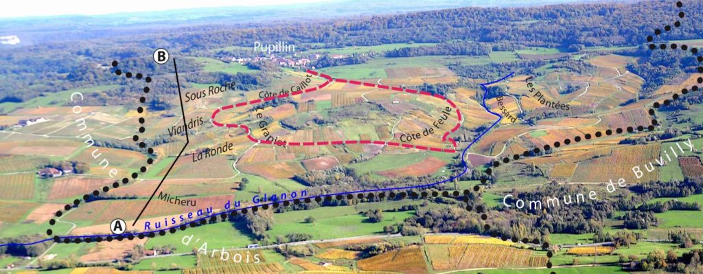 Les coteaux viticoles de Pupillin situés au pied du village sont faits de 3 versants. 2 d’entre eux sont en vis-à-vis séparés par le ruisseau le Glanon. Ce qui caractérise Pupillin, ce sont des sols de surface très minces car décapés par l’érosion du fait de la pente.
