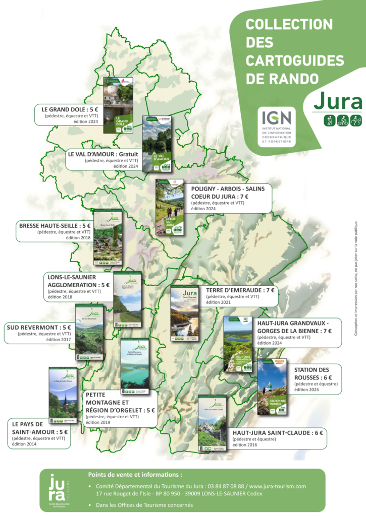 Le département du Jura compte aujourd’hui 12 cartoguides que l’on peut se procurer dans les différents Offices de Tourisme ou auprès de Jura Tourisme pour un prix unitaire compris entre 5 et 7 euros.