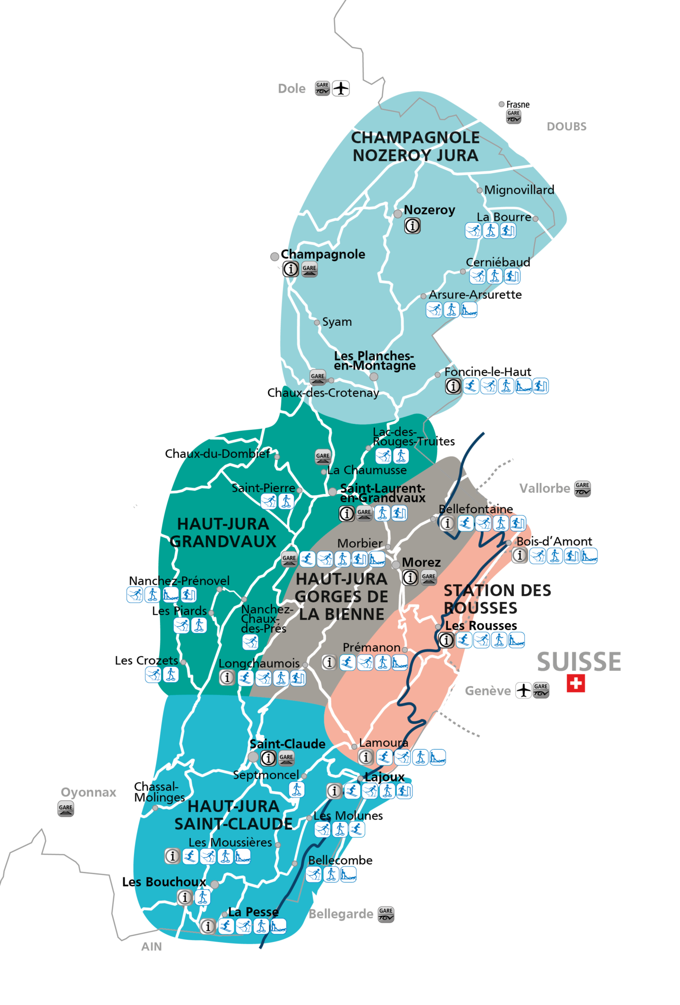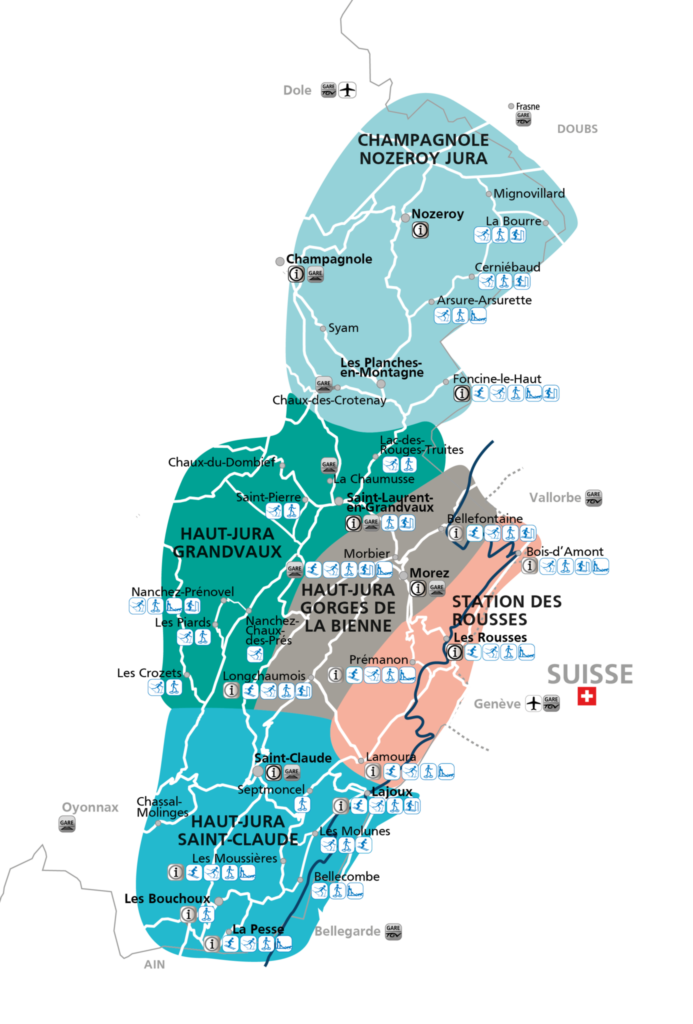 • Site nordique de la Haute-Joux : Cerniébaud – Chalet de la Hautes-Joux, Mignovillard – Chalet de le Bourre, Arsure-Arsurette -Chalet des Arches, Vaux et Chantegrue.
