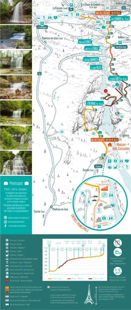 - Pour les randonneurs, le sentier principal de 7,4 km (aller-retour) relie les sept cascades majeures du site, dont l’Éventail (65 m) et le Grand Saut (60 m), en longeant la rivière du Hérisson. Ce parcours, classé difficile en raison de ses 250 à 300 m de dénivelé, requiert de bonnes chaussures et une préparation adaptée, mais offre une immersion totale dans la nature jurassienne. Des variantes plus courtes sont possibles en partant de différents parkings (Maison des Cascades, Ilay, Bonlieu, La Fromagerie), permettant d’ajuster la randonnée selon son niveau et son temps disponible.