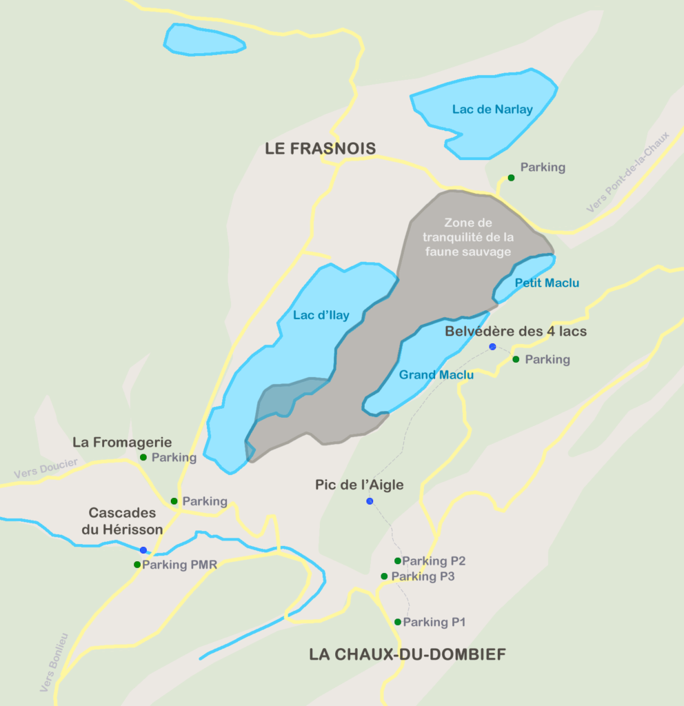 Le site des 4 Lacs comprend les lacs de Narlay, Ilay, Petit et Grand Maclu. Le Belvédère des 4 Lacs est un point de vue magnifique sur ces lacs. L’accès au Belvédère des 4 Lacs peut se faire à pied depuis le Pic de l’Aigle (prévoir d’être correctement chaussé) ou en voiture depuis le village de la Chaux-du-Dombief. Un parking est situé à 5 min à pied du point de vue (l’accès est sans difficultés majeures sauf pour les personnes à mobilité réduite : sol parfois glissant et présence de marches conséquentes).